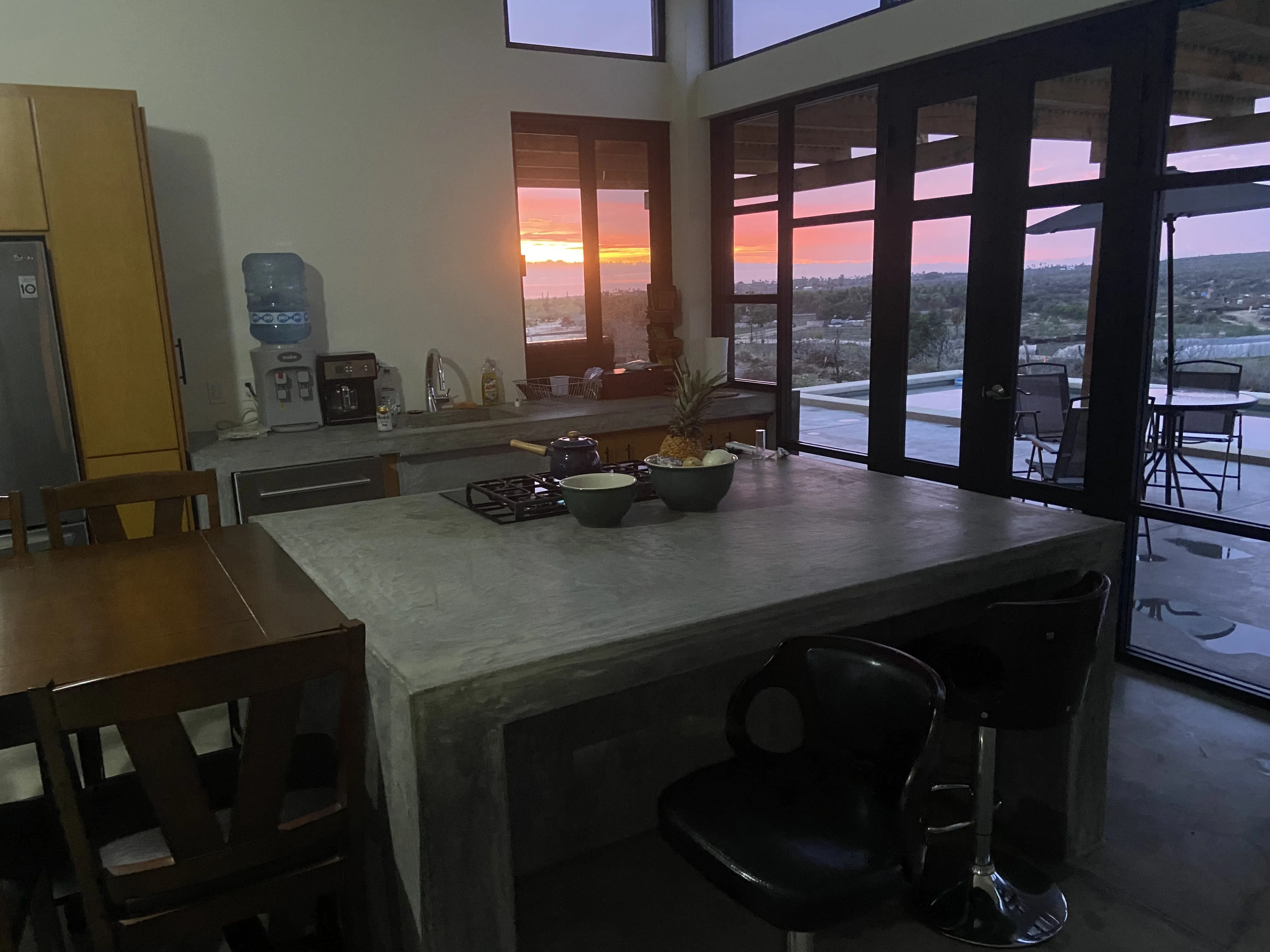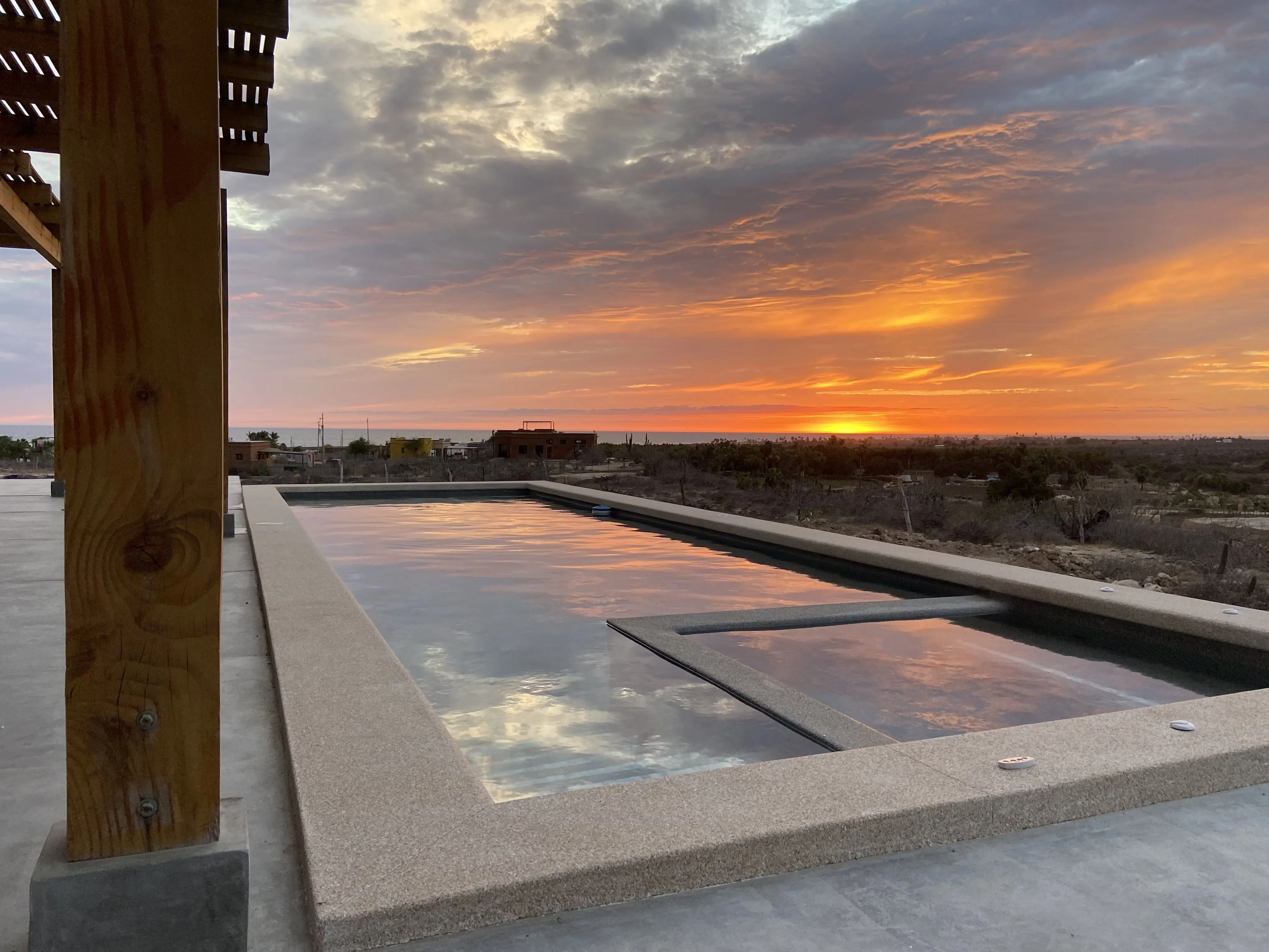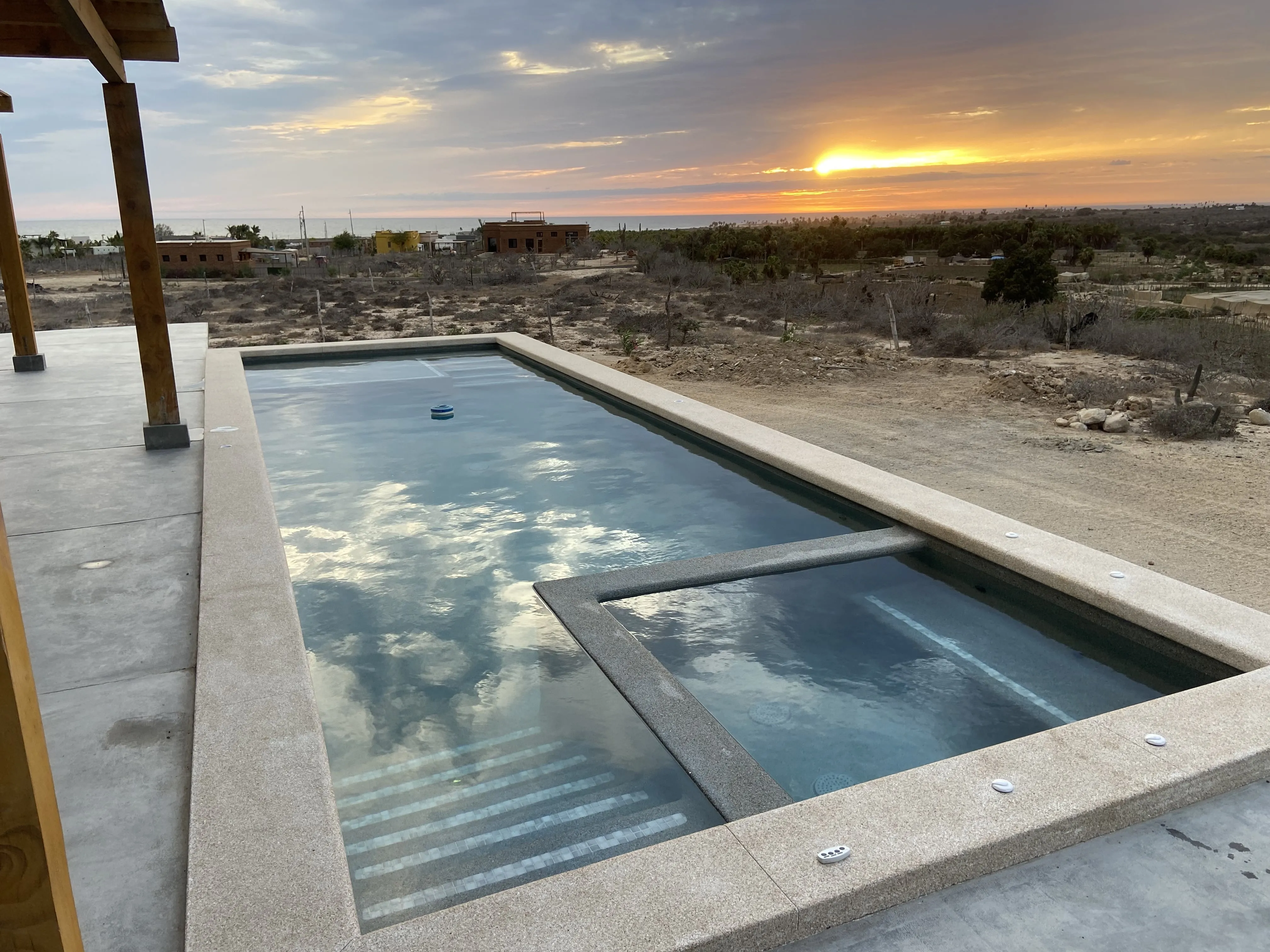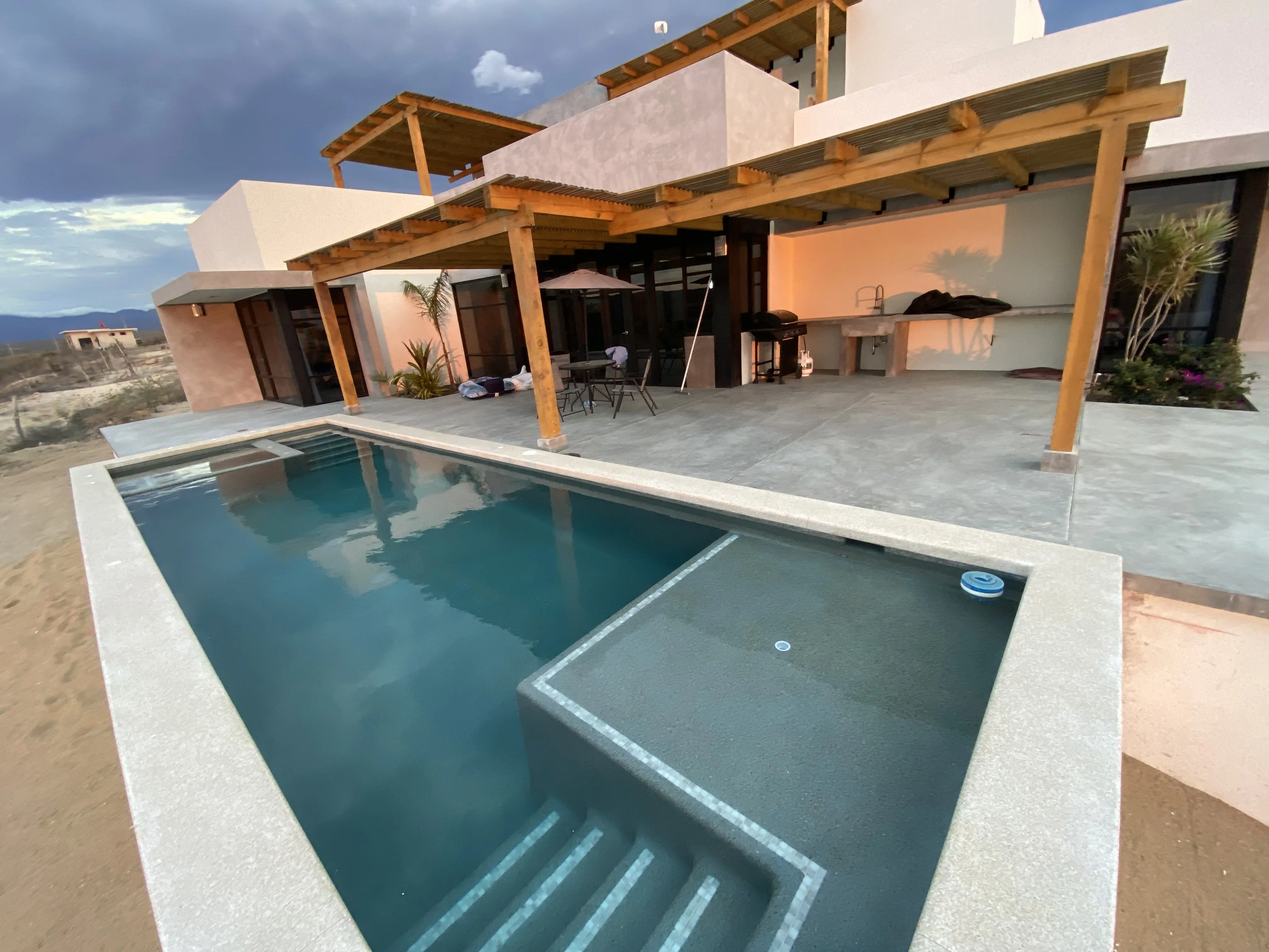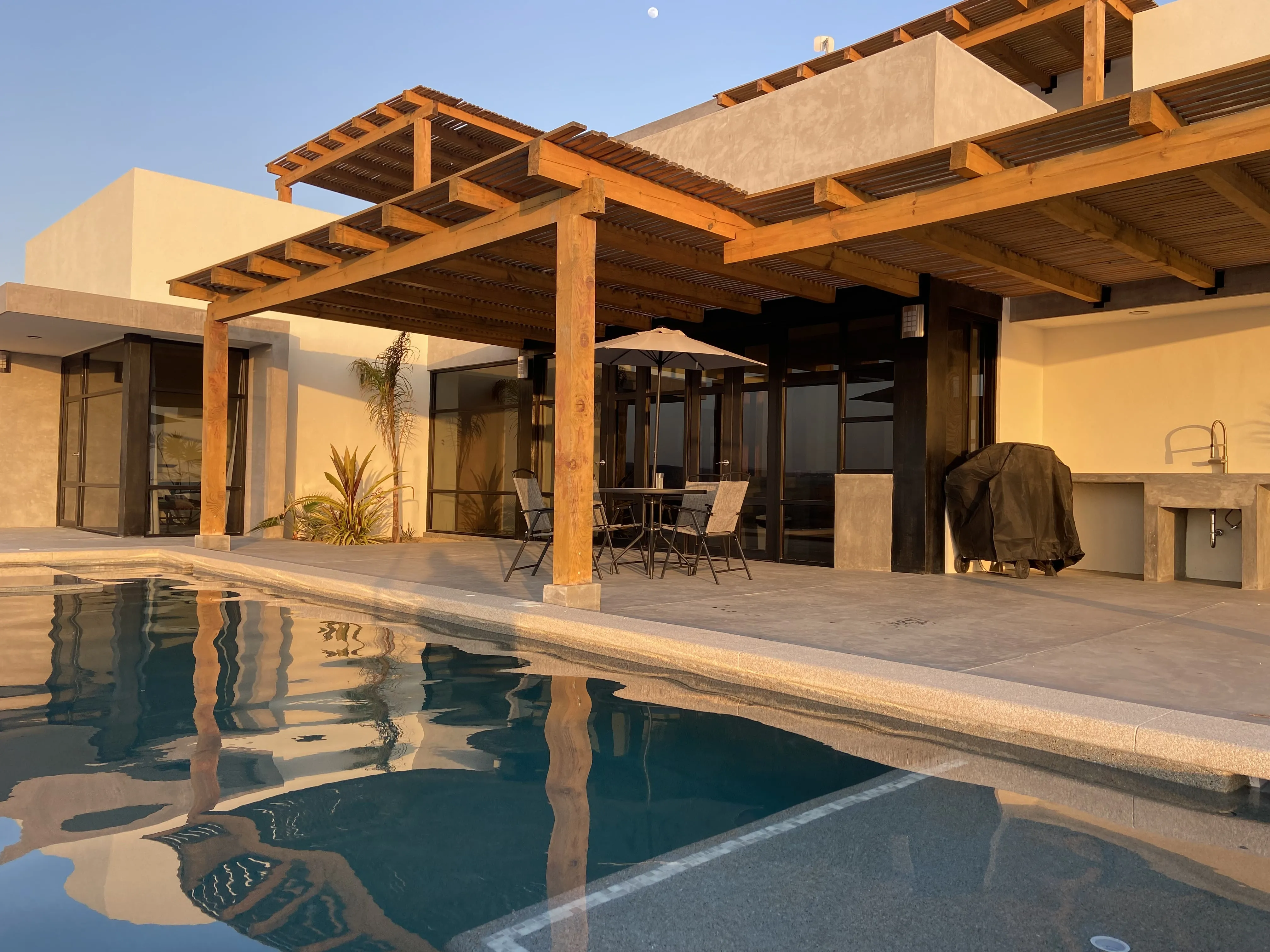 Downstairs: This 2 bedroom 2 bath modern home is beautifully designed with plenty of amazing ocean, farmland and mountain views. A/C units, plenty of space, LED light colored pool and tub, both heated, are just some of the amenities The home offers plenty of outdoor living and is very well located, close to a world class surf break, La Pastora surf beach. The home also features Starlink Wifi, a new BBQ grill , landscaped atrium, a very well equipped kitchen, accessible from the pool area, and drinkable water available from the home purification system.